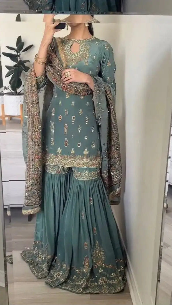 Work: Rivet Moti Work, Embroidery Sequence, and Lace Border